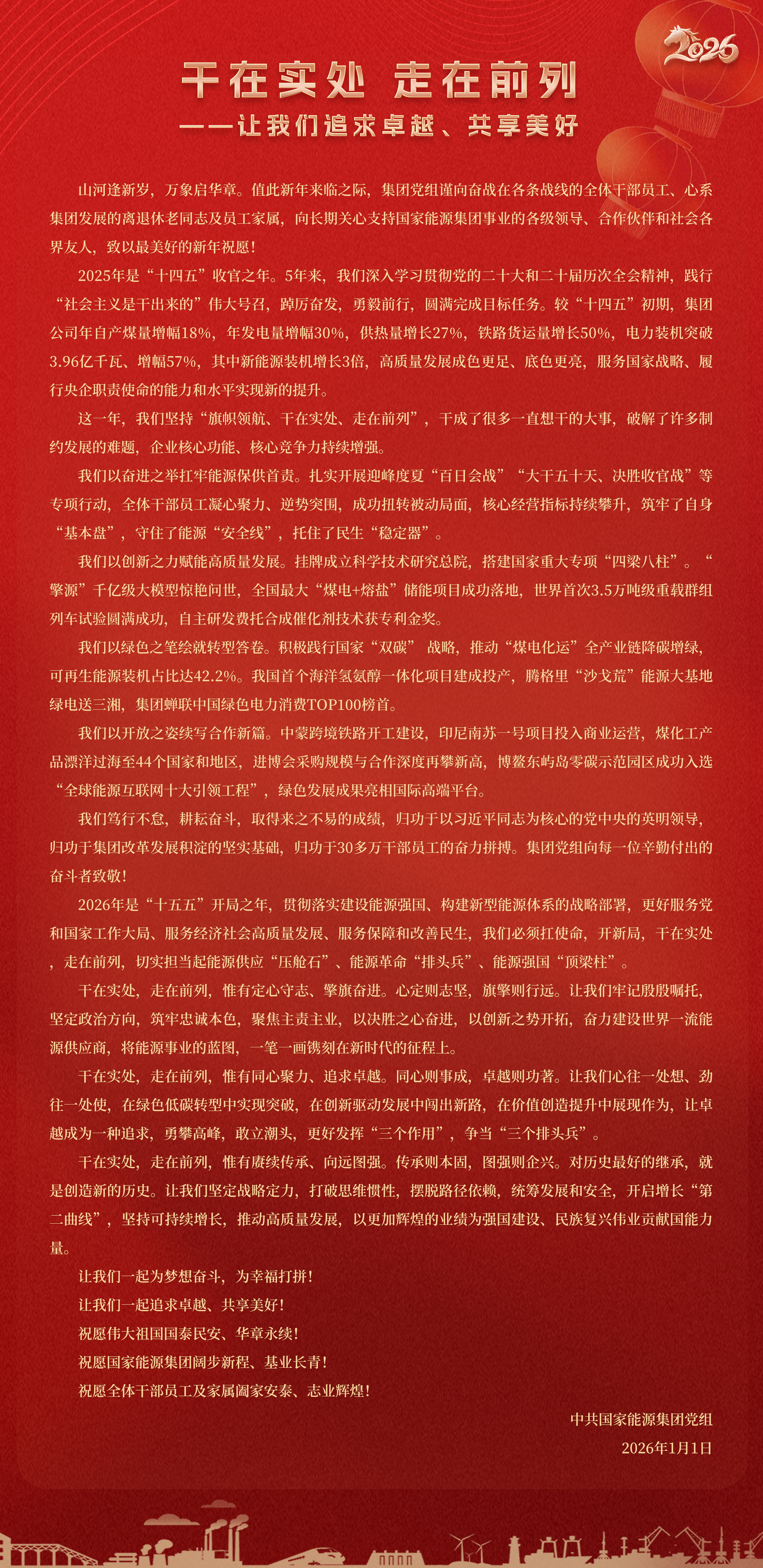 國家能源集團胸懷“國之大者”,增產增供、穩價穩市,積極服從服務國家戰略、保障國家能源安全、助力國民經濟穩增長,推動煤炭安全綠色智能、煤電清潔高效穩定、現代煤化工高端多元低碳、運輸物流協同一體、新能源多元創新規?;l展,全力擔當能源強國頂梁柱,能源供應壓艙石,能源革命排頭兵。